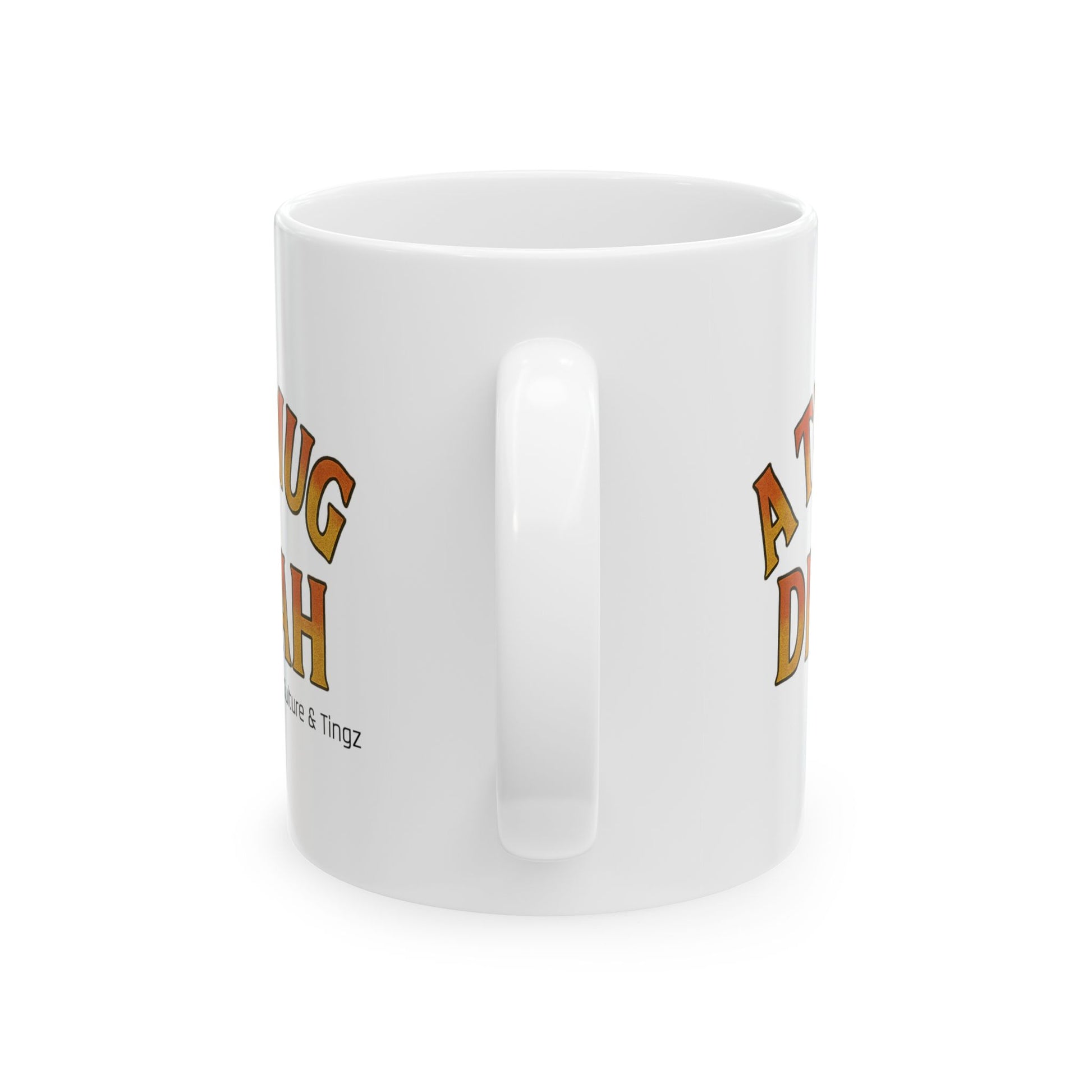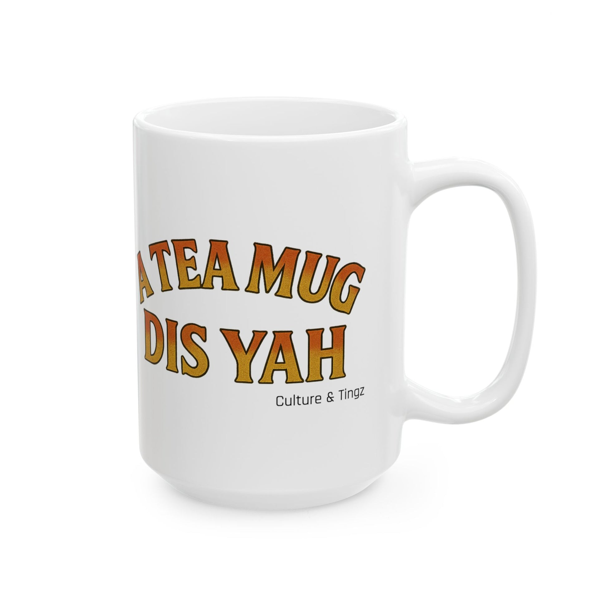 Steep your culture with the A Tea Mug Dis Yah – Letterwork Edition. Featuring bold red, gold, and orange gradient lettering, this mug keeps it simple yet powerful — a playful nod to Jamaican patios that turns every tea break into a cultural statement.