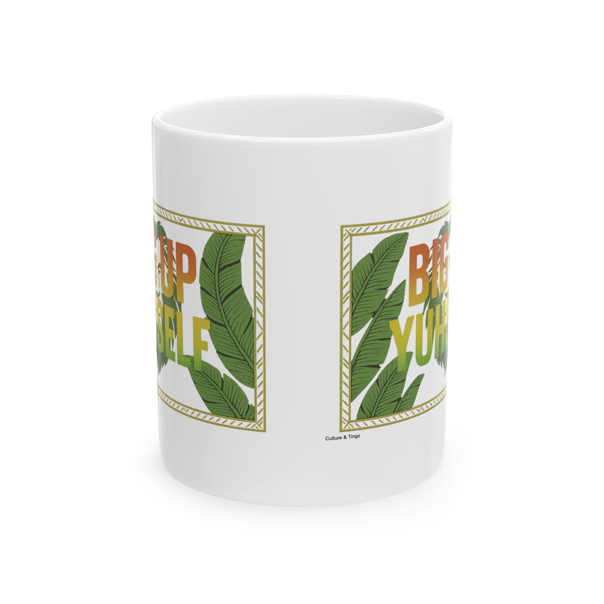 Start your morning with confidence and culture — the “Big Up Yuhself” Mug isn’t just drinkware, it’s a bold reminder to celebrate yourself daily. Featuring striking red, gold, and green gradients, tropical banana leaf accents, and a powerful lion motif, this piece blends Jamaican pride with everyday functionality.
