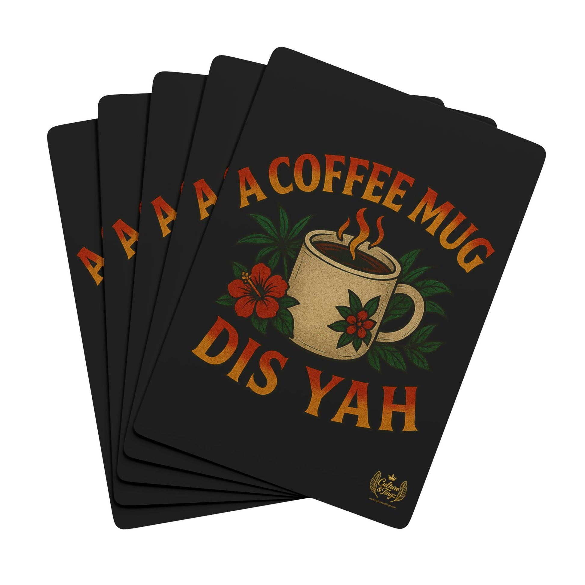 Bring culture to the card table with the “A Coffee Mug Dis Yah” Playing Cards — a witty Jamaican Patois phrase turned into a bold, collectible design. Perfect for game nights, family gatherings, or poker with friends, this deck combines Caribbean pride with high-quality craftsmanship.