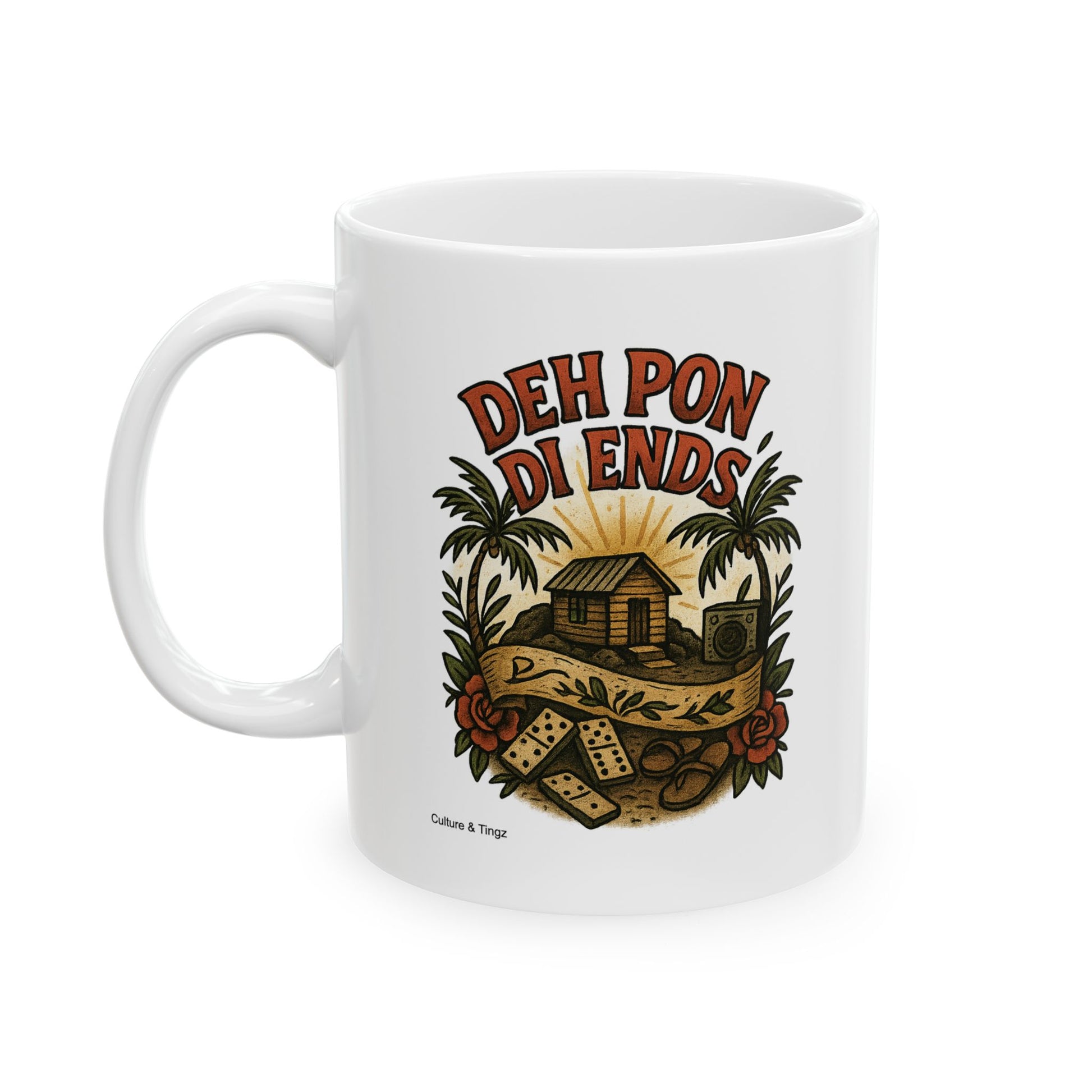 TheĀ Deh Pon Di EndsĀ mug is a tribute to the corners where Caribbean culture lives and breathes ā the zinc fences, domino tables, old-school radios, and the heartbeat of sound system speakers. Inspired by Kingston streets and island neighborhood vibes, this design captures the everyday soul of the Caribbean.