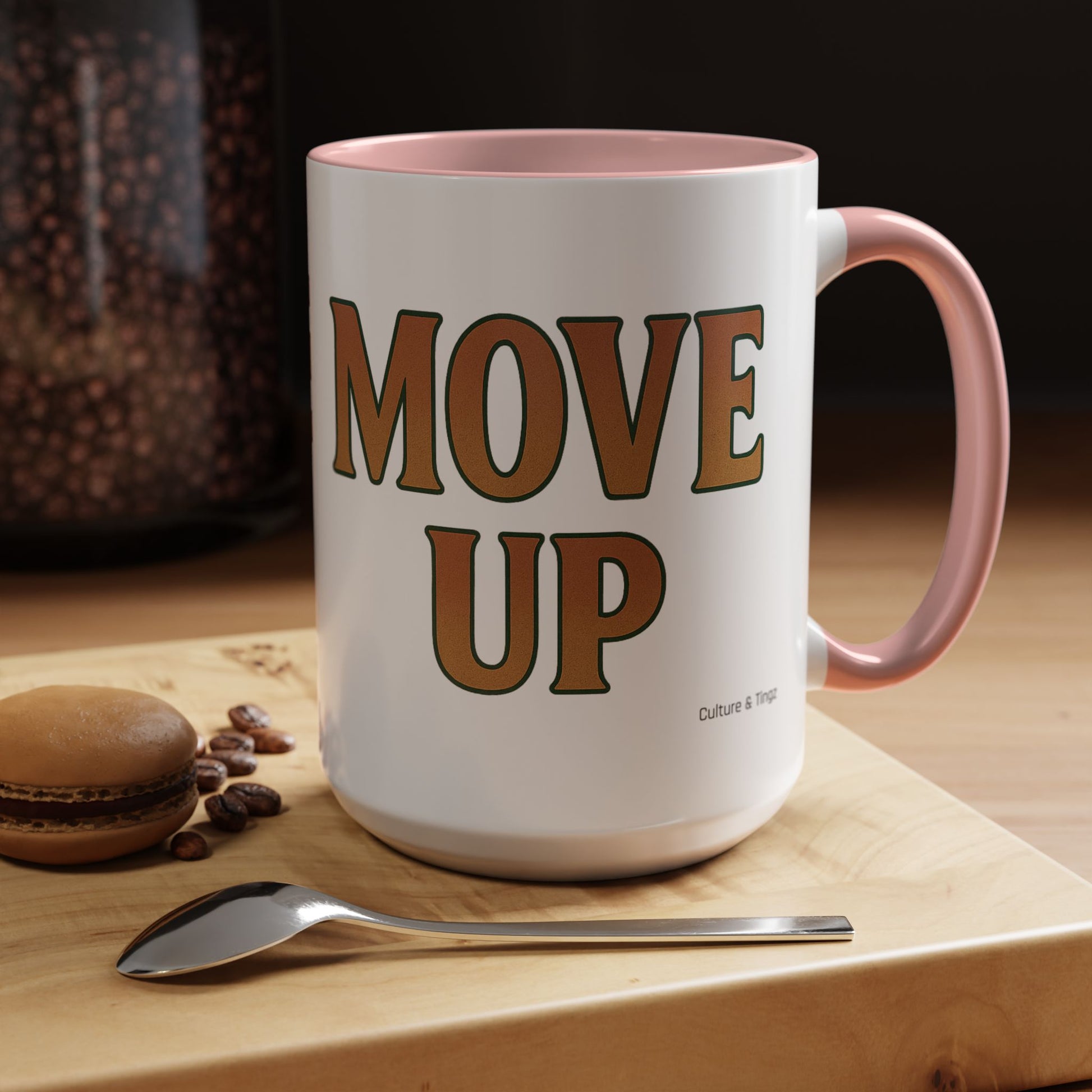 Bold and commanding, the Move Up – Letterwork Edition delivers the patios message loud and clear: keep it moving. Rendered in striking orange-gold distressed lettering with a dark green outline, this design represents strength, confidence, and forward motion in true Caribbean style.