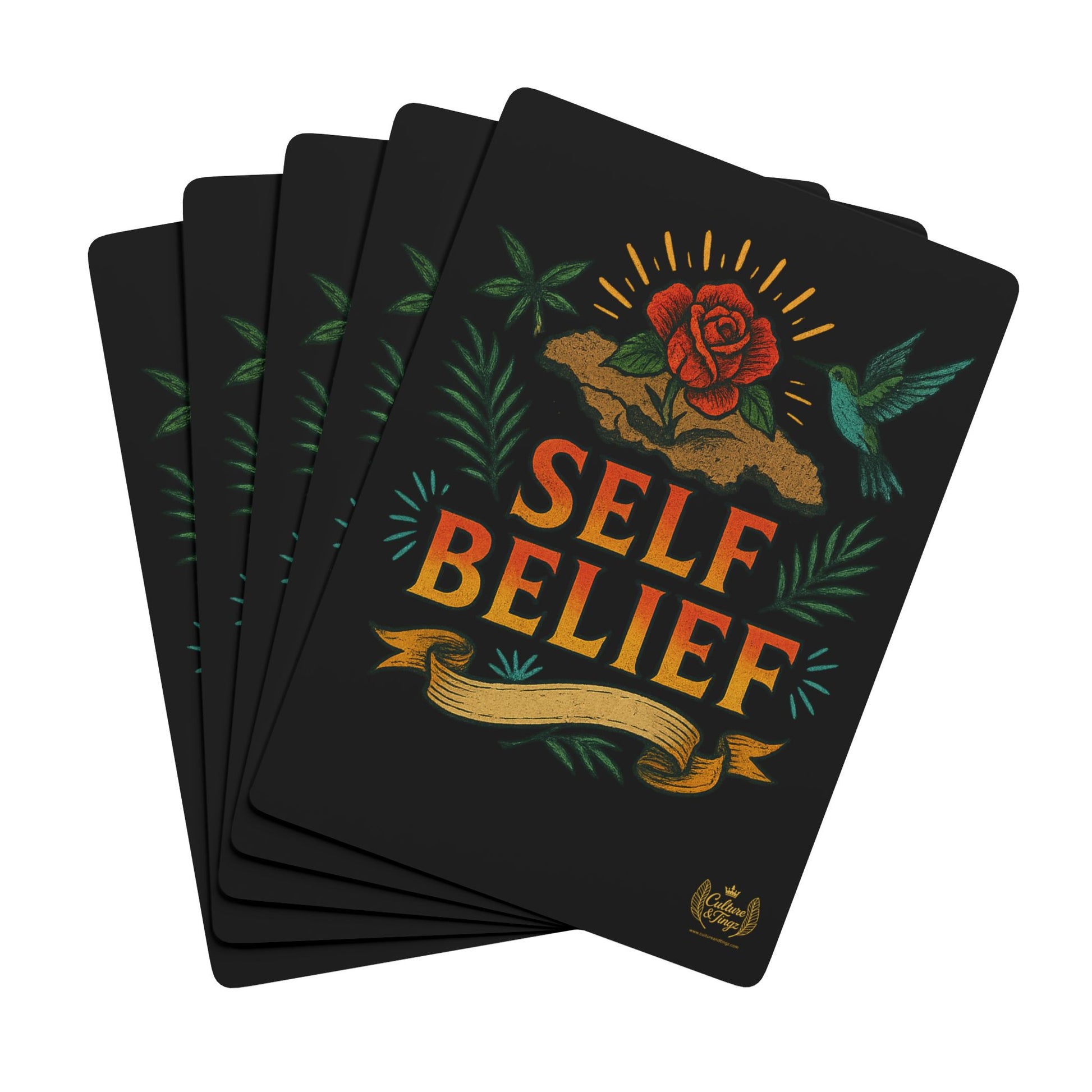 The “Self Belief” collection was born from the heart of Caribbean resilience — where zinc fences meet city corners, and the sea breeze carries the songs of generations. This design symbolizes the unshakable faith and determination of the islands, brought to life through tattoo-inspired textures and bold Caribbean colors.